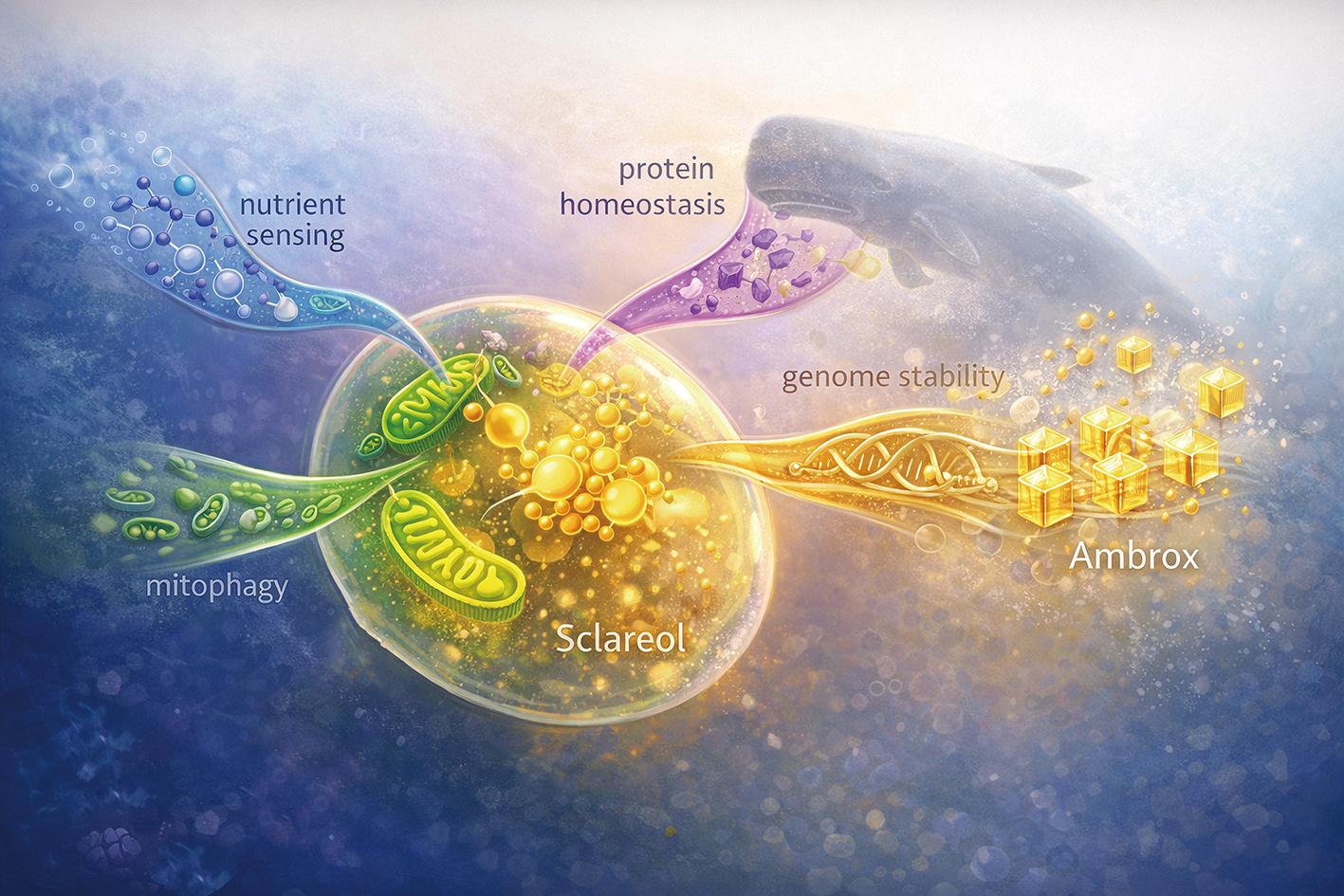 Engineering yeast longevity boosts sustainable sclareol production, a valuable precursor for the synthesis of perfume Ambrox. Extending cell lifespan through four longevity pathways dramatically increased sclareol yields—without the cellular stress of traditional methods or harvesting from endangered whales. (Image generated by AI)