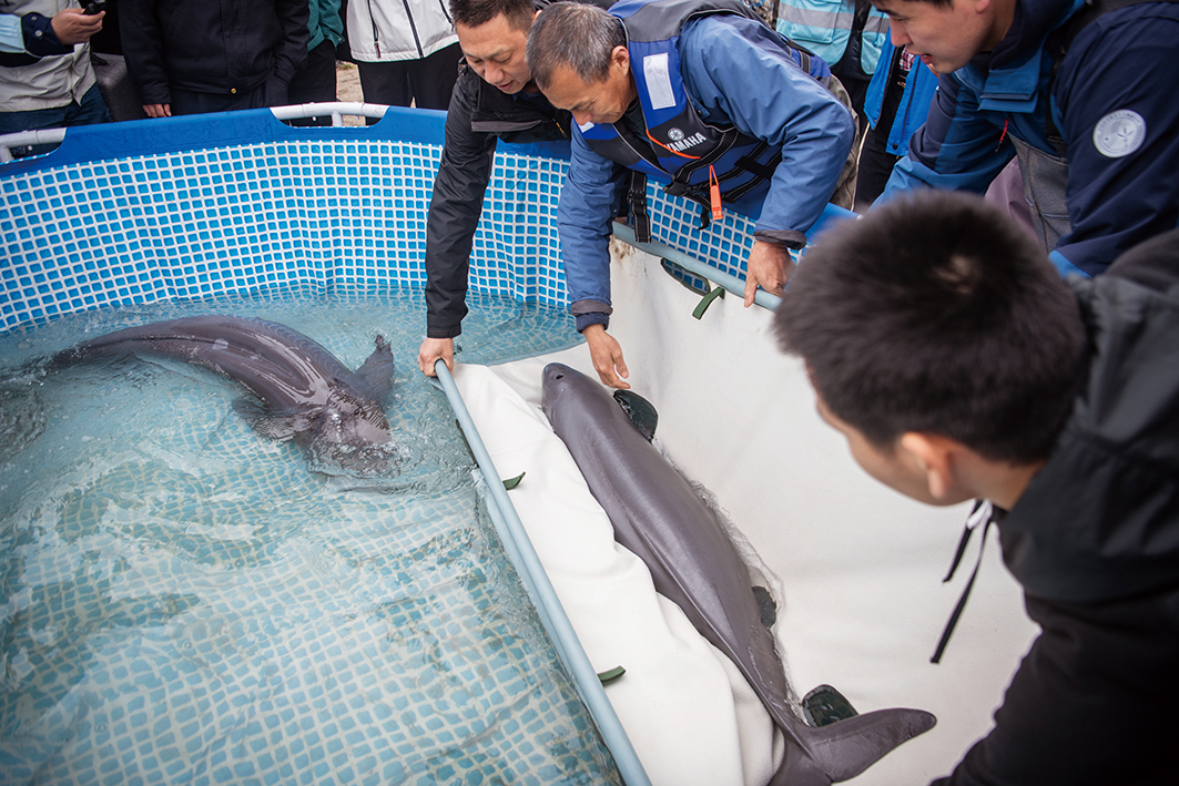 Fig. 2. Transferring the finless porpoises from the rewilding training waters in the Yangtze River to a releasing site. (Photo by the Hubei Changjiang Xinluo Section Baiji National Nature Reserve)