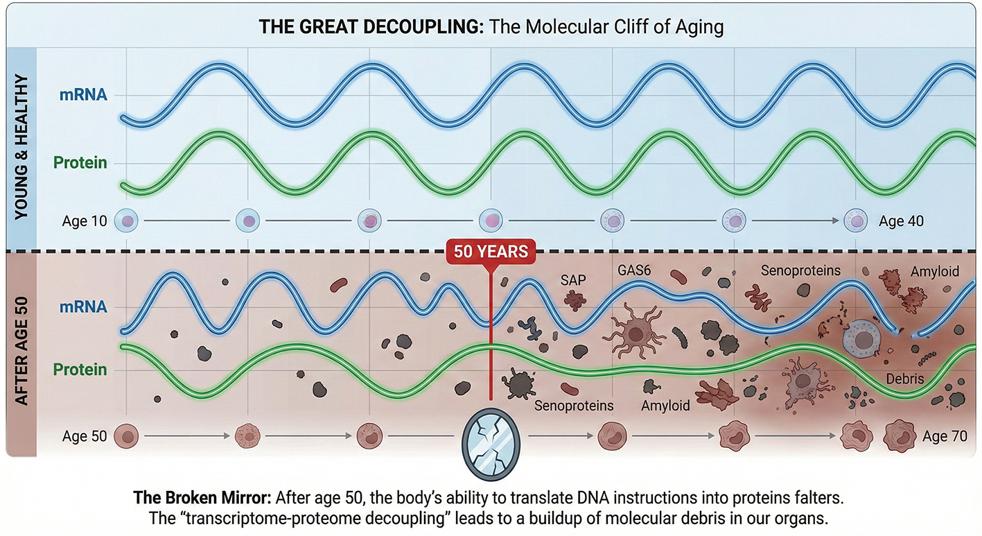 The Broken Mirror: After age 50, the body’s ability to translate DNA instructions into proteins falters. The “transcriptome-proteome decoupling” leads to a buildup of molecular debris in our organs. (Illustration generated with AI)