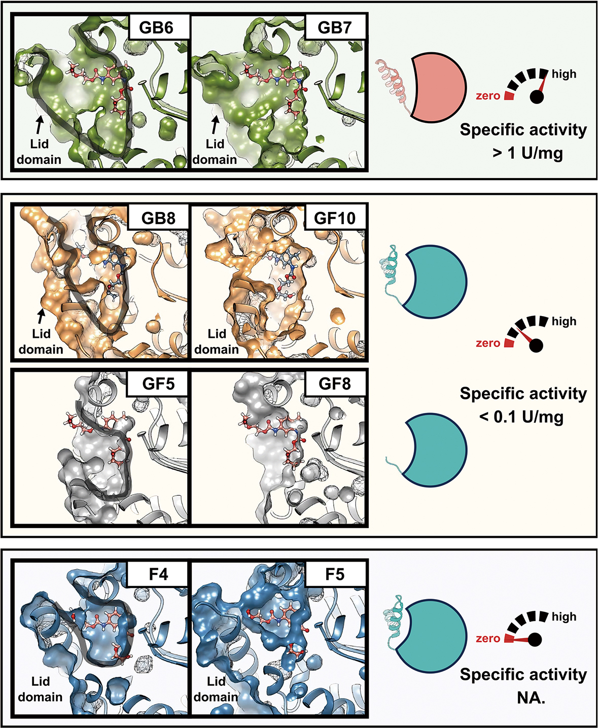 Locking the Active Site: How “Lid” stability dictates enzyme performance. This comparison shows how the stability of an engineered “lid” domain (dark outlines) determines the efficiency of polyurethane-degrading enzymes. While rigid lids in highly active variants of AbPURase (GB6, GB7) protect the catalytic pocket, unstable or misaligned structures in other candidates lead to a dramatic loss of function. (Graphic: Chen et al., 2025)